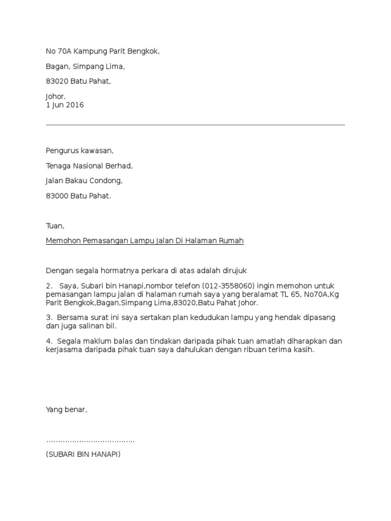 Contoh Surat Rasmi Permohonan Pemasangan Lampu Jalan